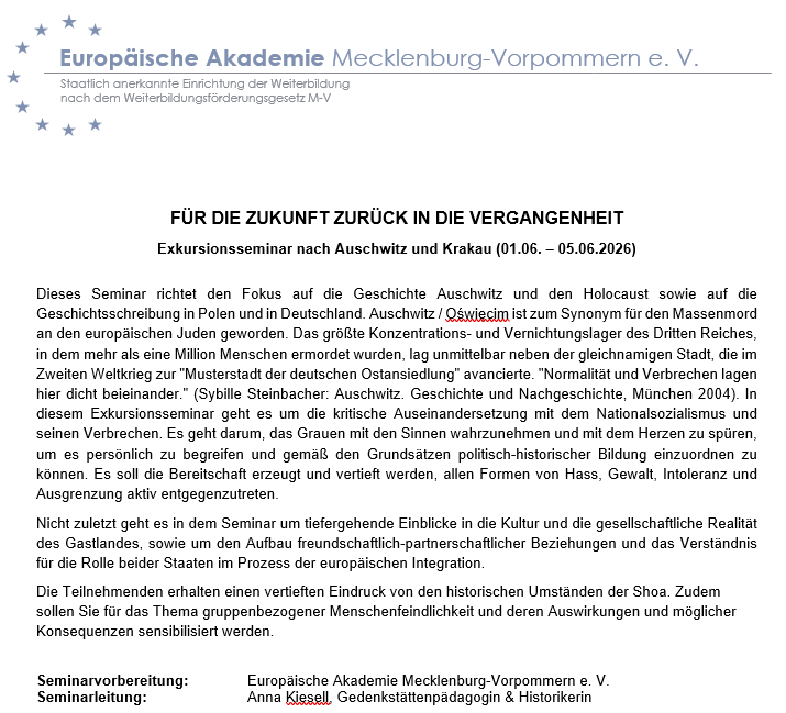 Für die Zukunft zurück in die Vergangenheit - Exkursion nach Auschwitz / Krakau (01. - 05. Juni, 2026)